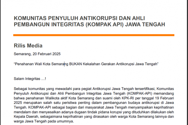 adalah wadah komunikasi dan wahana pemberdayaan potensi Penyuluh Antikorupsi (PAK)/Ahli Pembangun Integritas (API) yang memiliki sertifikat kompetensi dari Lembaga Sertifikasi Profesi (LSP) KPK-RI. KOMPAK API bermaksud mendorong terciptanya kesatuan langkah PAK dan API di seluruh wilayah Jawa Tengah dalam melakukan Pendidikan antikorupsi dan pembangunan budaya integritas, serta membangun kolaborasi dengan para pemangku kepentingan dan mitra kerja menuju budaya masyarakat Jawa Tengah dan Indonesia yang antikorupsi, bersih, transparan, akuntabel dengan tetap mempertahankan nilai-nilai kearifan lokal yang sesuai.